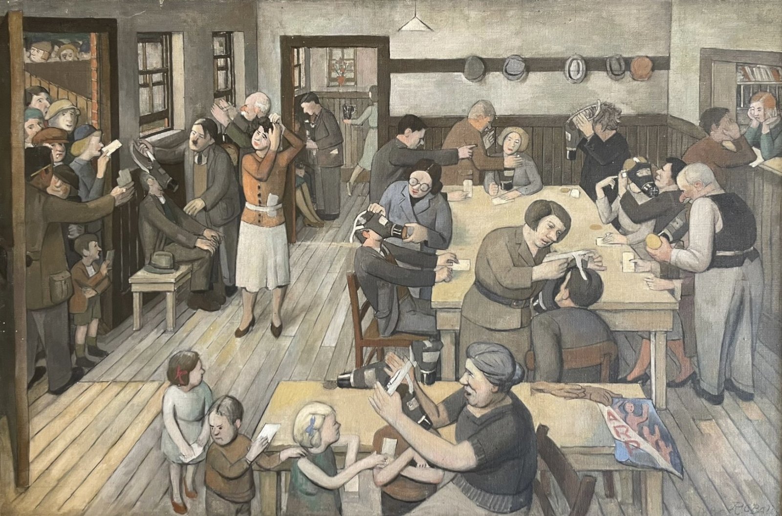 Robin’s early influences were the newspaper cartoons of the early 1920s, and it’s an often humorous slant on difficult subjects that stands his work apart. Take Gas Mask Practice from 1938; here we see a local community being shown how to fit and use gas masks, in readiness for the impending conflict in Europe. Within the painting we can see an unhappy boy, a courting couple, even Hitler makes an appearance assisting with the day!