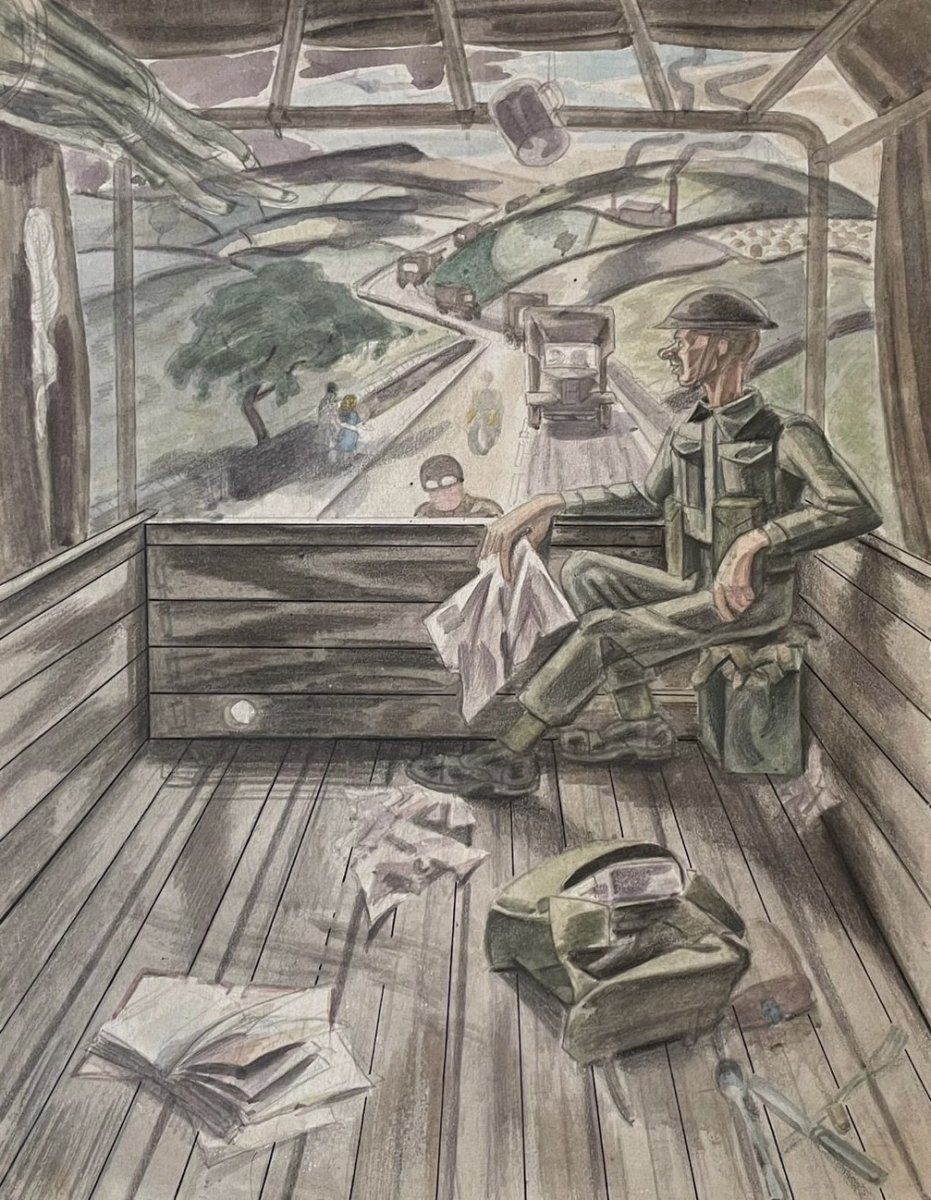 Robin served in the Royal Artillery during the war, helping set up and man heavy anti-aircraft positions on the beaches of Normandy on D-Day. For the course of the war he was virtually never without pencil, colours and paper even when on active duty. Many of his works depict the ordinary, the daily routine of the squaddie; In Convoy, circa 1942 is one such example amongst many others.