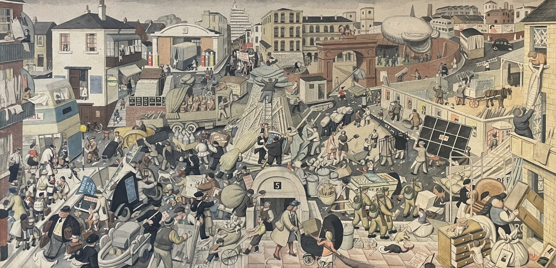 Away from army life, Robin Ball also produced what can only be described as an astounding painting of domestic preparations; Preparing for War, Hastings, 1940 shows the town filled with its inhabitants, all making various war/invasion preparations and in typical manner, placing a humorous slant to proceedings.