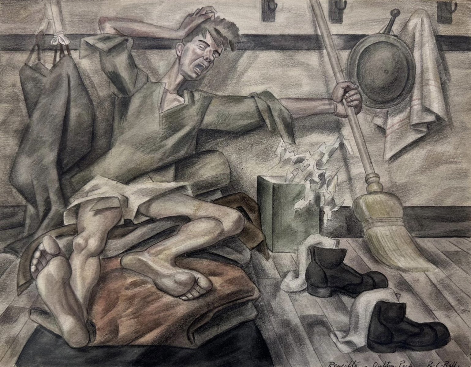 One of our favourites is the Nash/Spencer-like Reveille painting from 1940. Likely a depiction whilst on basic training, it shows the soldier being abruptly woken by the Reveille, usually a wake-up call through bugle or drums.