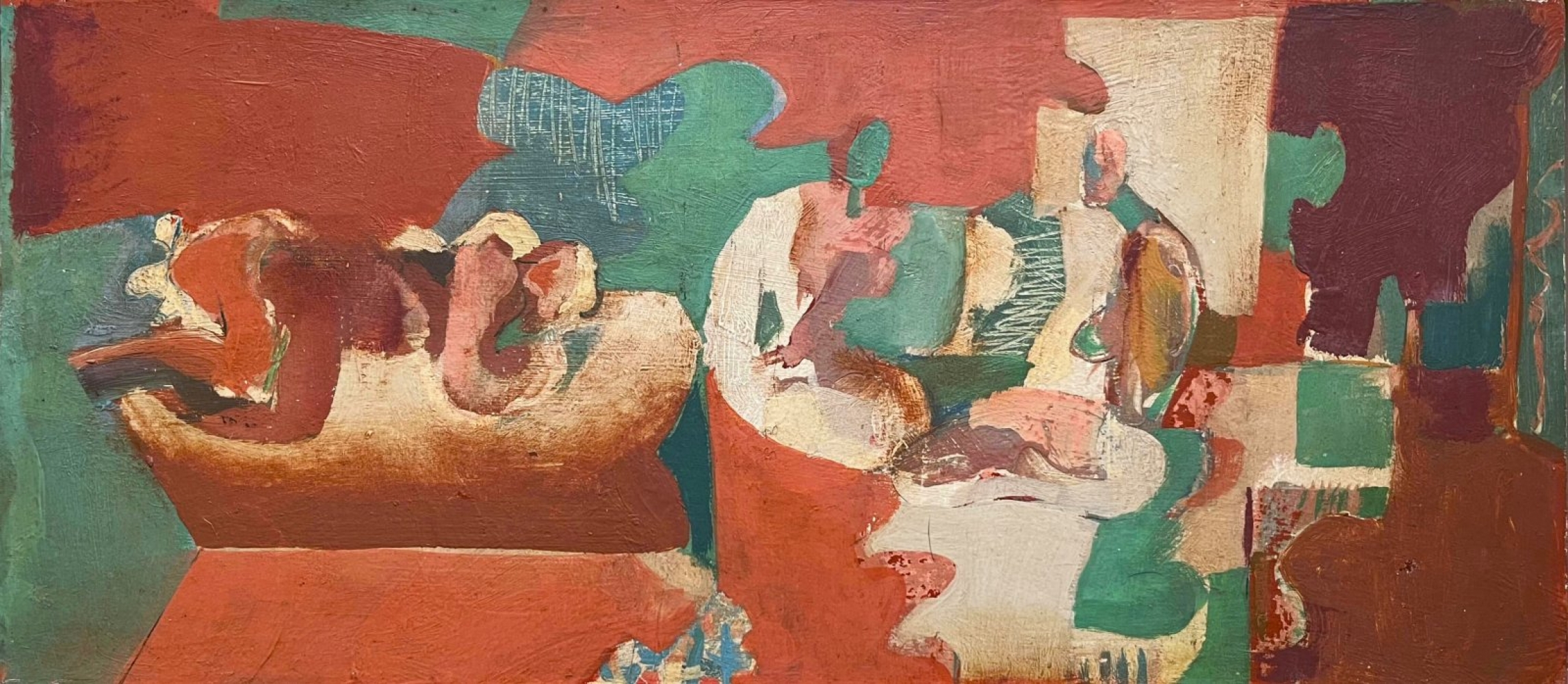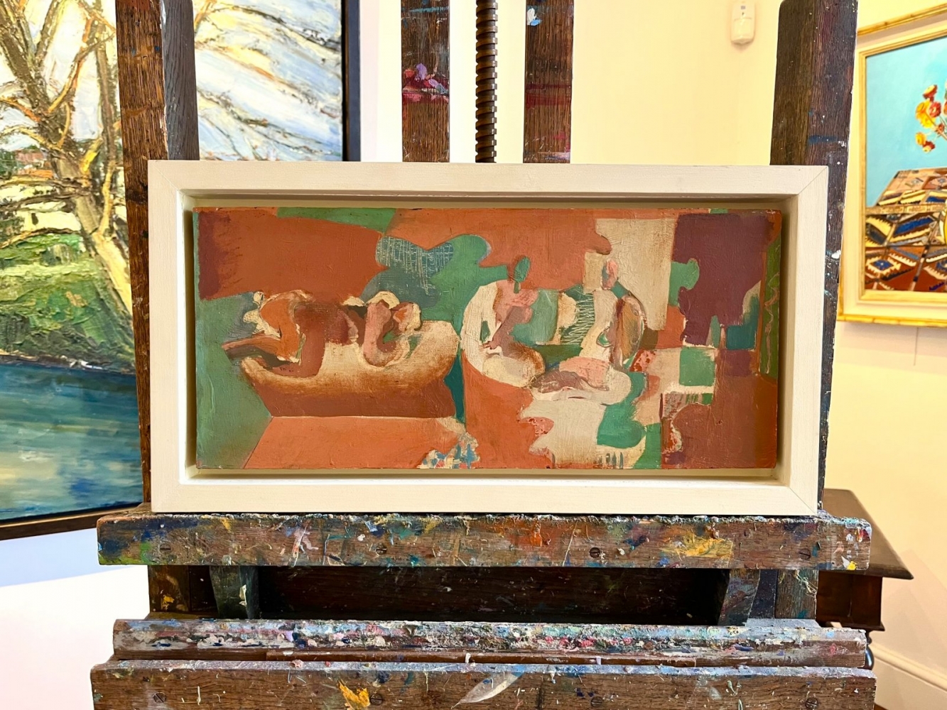 A wonderful oil on board, a fusion of the figurative with the abstract; interlocking shapes suggesting human form, combined with an almost Henry Moore-like reclining figure to the left (facing)