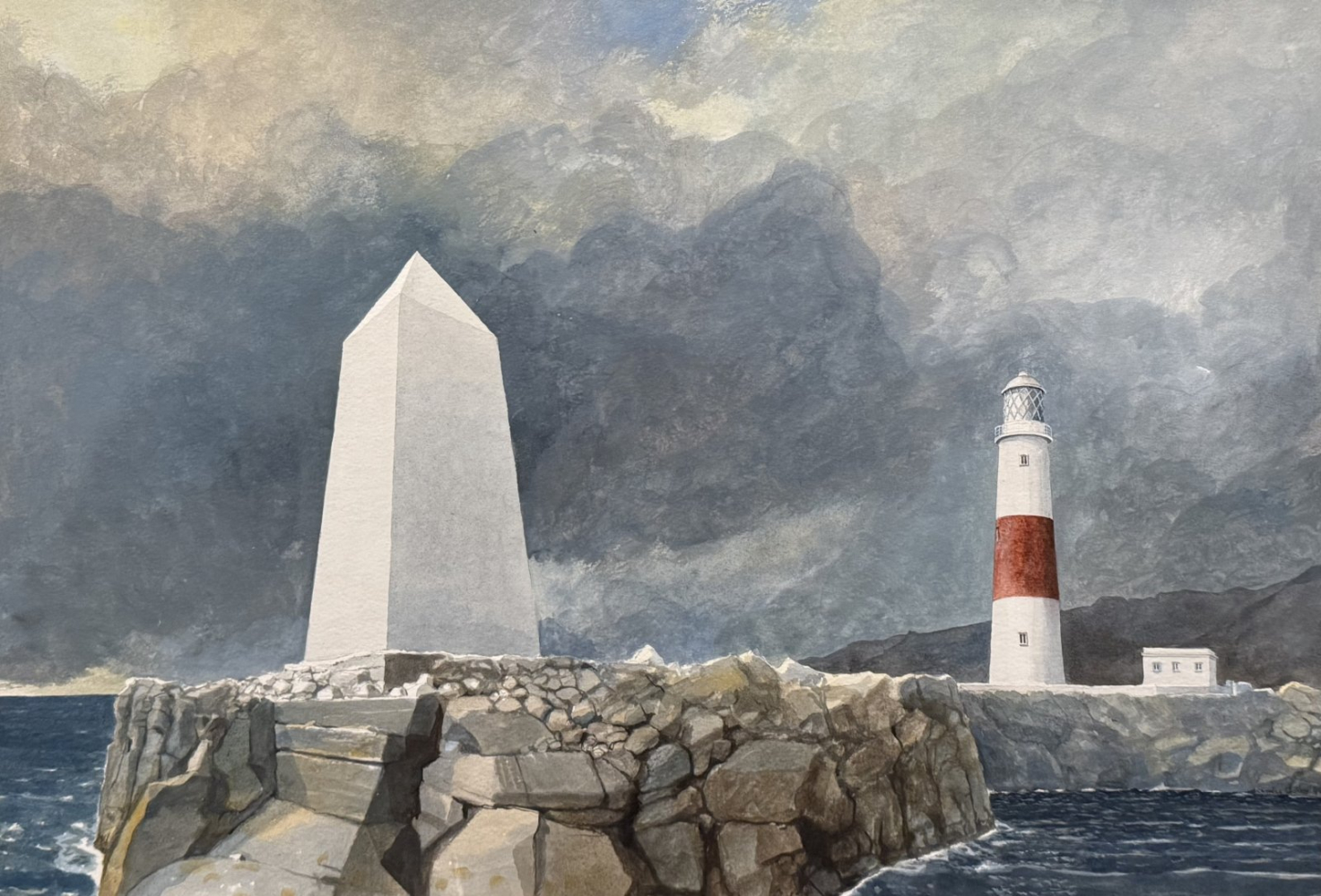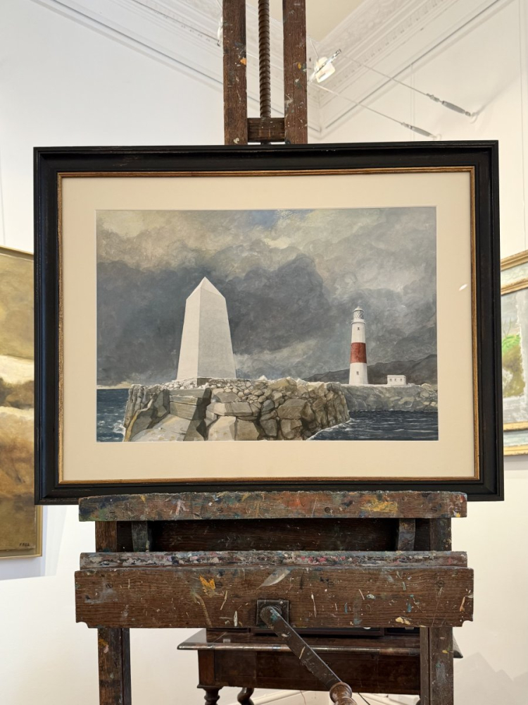 The scene shows a view of Portland Bill lighthouse with the Trinity House obelisk in the foreground. The red band encircling the lighthouse was intended to increase visibility against cloudy skies for to mariners during the day. The Trinity House obelisk was built in 1844 to warn ships off the coast of Portland Bill. Made of Portland Stone, the obelisk stands at the southern tip of the Isle of Portland on a low shelf of rock extending 30 metres south into the sea. Trinity House is a charity dedicated to safeguarding shipping and seafarers. It’s not known why Charles Oakley painted this particular subject or if he ever visited this part of Dorset; he may have been attracted by the sculptural form of the obelisk against a threatening stormy sky with the lighthouse beyond.
