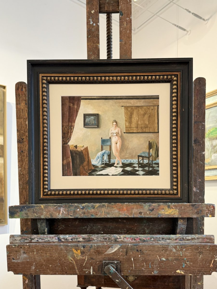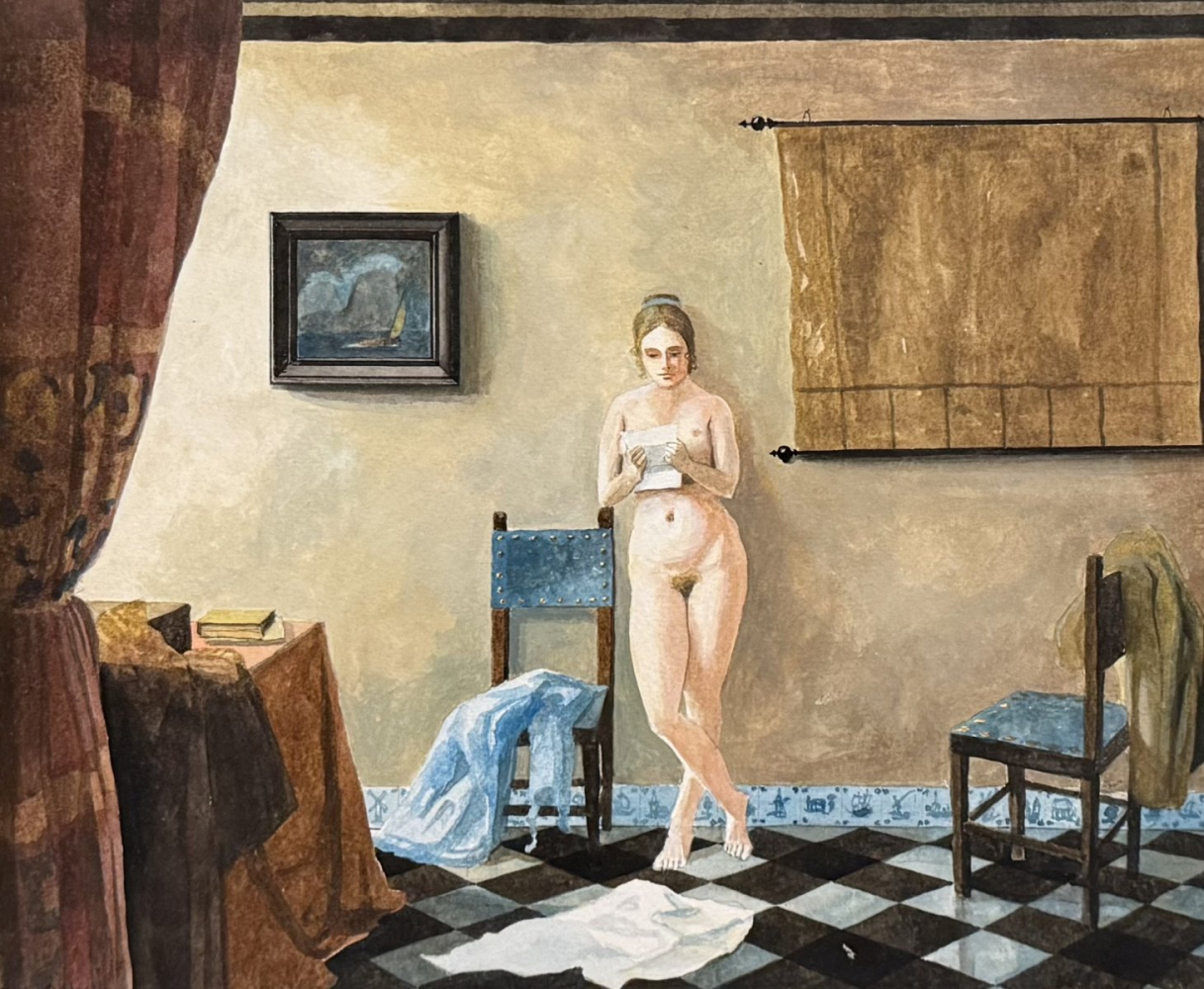 Visits to Dutch museums with the fine art students from Newcastle Poly gave Charles Oakley the opportunity to absorb the incredible skill and detail of the Dutch masters. He admired the intimate moments observed in Vermeer’s interiors and the play of light and shade that brought the mysterious scenes to life. In this painting, Charles Oakley has played with Vermeer’s theme, capturing the letter-reader, one assumes alone, in a state of undress, surrounded by the familiar objects and furnishings from the original painting, the blue dress draped over a chair. The Delft tiles that skirt the room are inspired by other Vermeer paintings and observations that Oakley made on his visits to the Netherlands.