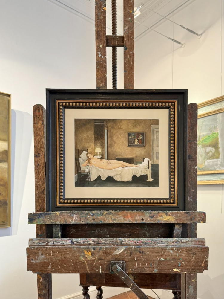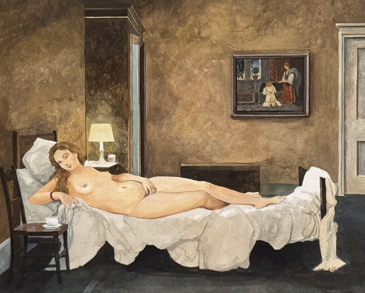 Early in Charles Oakley’s career he painted a number of bed-sitter scenes, inspired by the flat in Bayswater, London, where he lived as a student. However, the bedsit depicted in this painting is rather less shabby than those he painted in the early 50’s. The nude is shown in the same pose as Venus, but the servants depicted in the background of Titian’s original, have now become the subject of a painting on the wall behind.