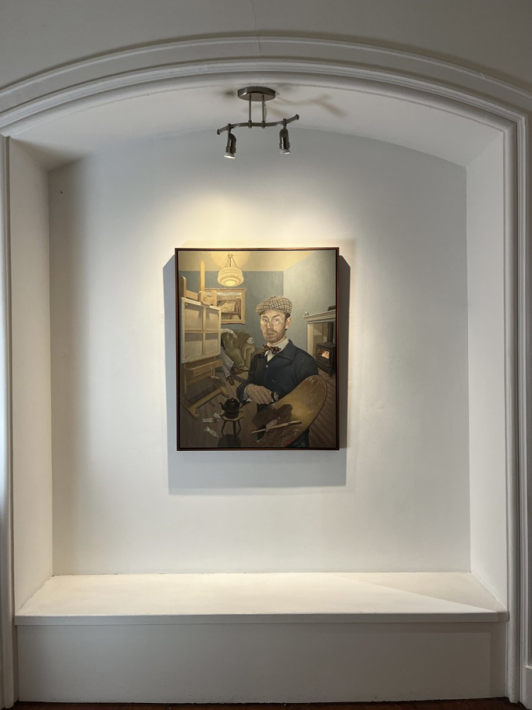 A self portrait, with the artist standing in the foreground in his front room. There are paint tubes on the floor, Craig’s signature Brown Betty teapot (which he has included in a number of previous paintings), the fires lit and there’s a partially hidden figure behind the canvas on the easel. Craig’s interest in light, especially manufactured, is successfully executed in this painting with the muted light from a 1930s flycatcher shade which creates a warm glow and is being reflected onto his palette.