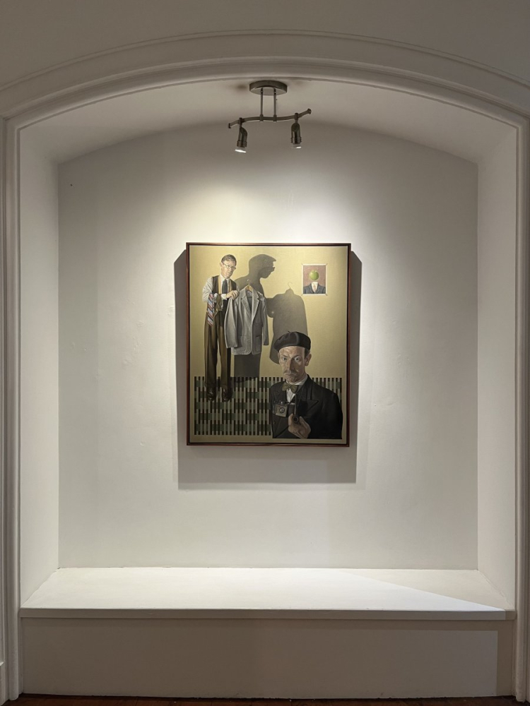 A double self portrait based on Craig’s own experiences when working in retail at a gentleman’s outfitters in Brighton, before moving to Cumbria to focus on his art full time. In this painting Craig is both the salesman and the customer. There is also a nod to the surrealist artist René Magritte, with his famous L’Idée (The Idea) poster taped to the wall