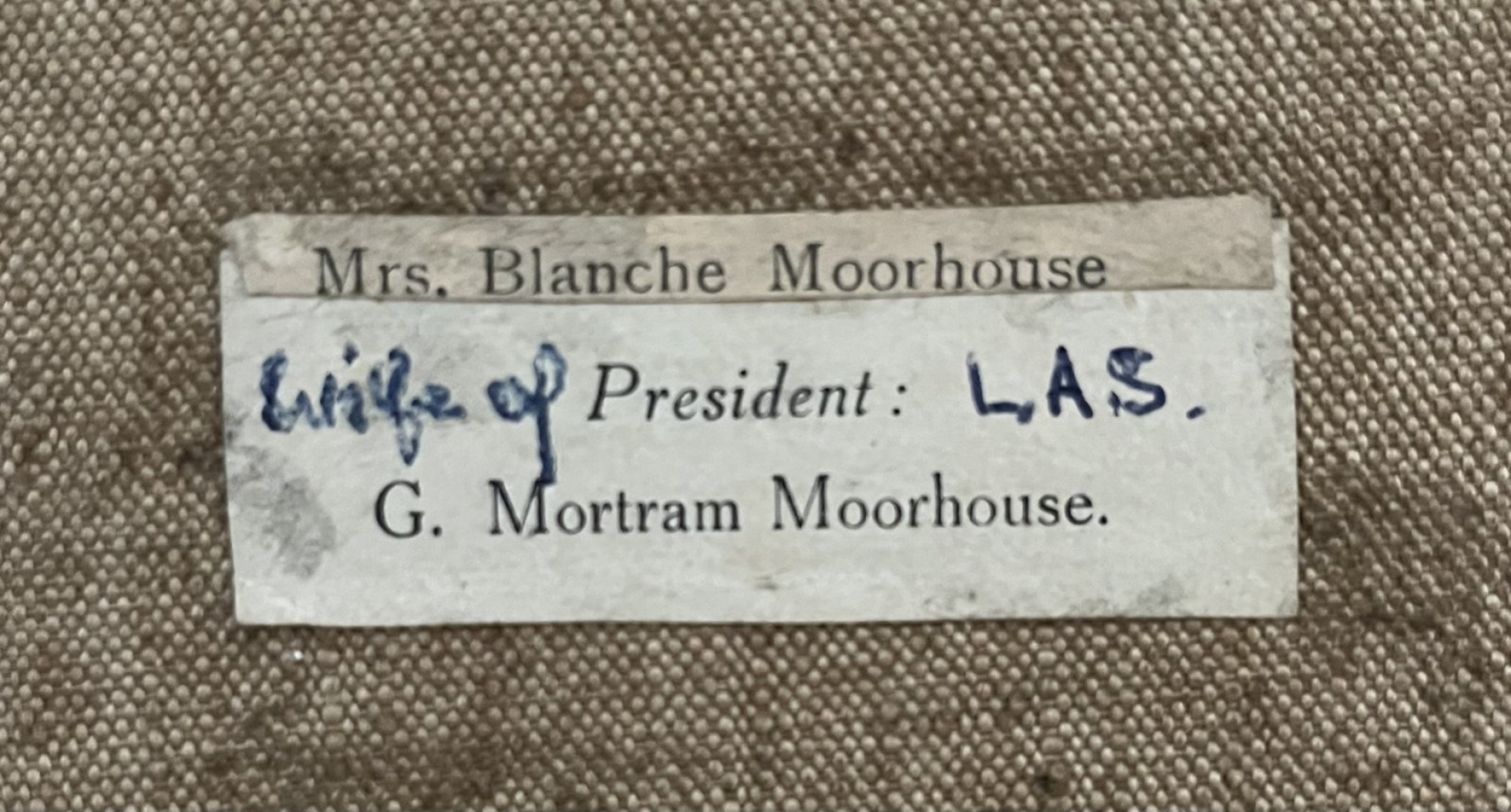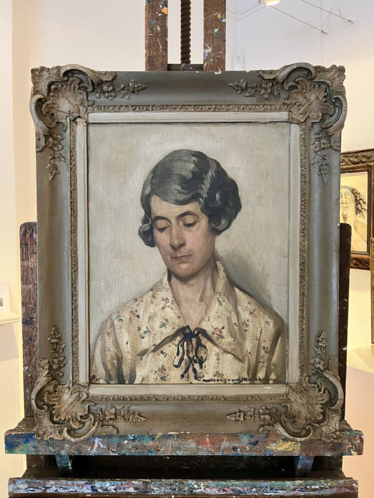 The small artist's label to the back of the canvas, identifying the sitter as his wife Blanche, states that he is the President of the Lake Artists Society. Moorhouse held this position from 1946-1949, but the hair and clothes of the sitter are from an earlier time, circa 1930, so we must assume the label was applied at a later date.