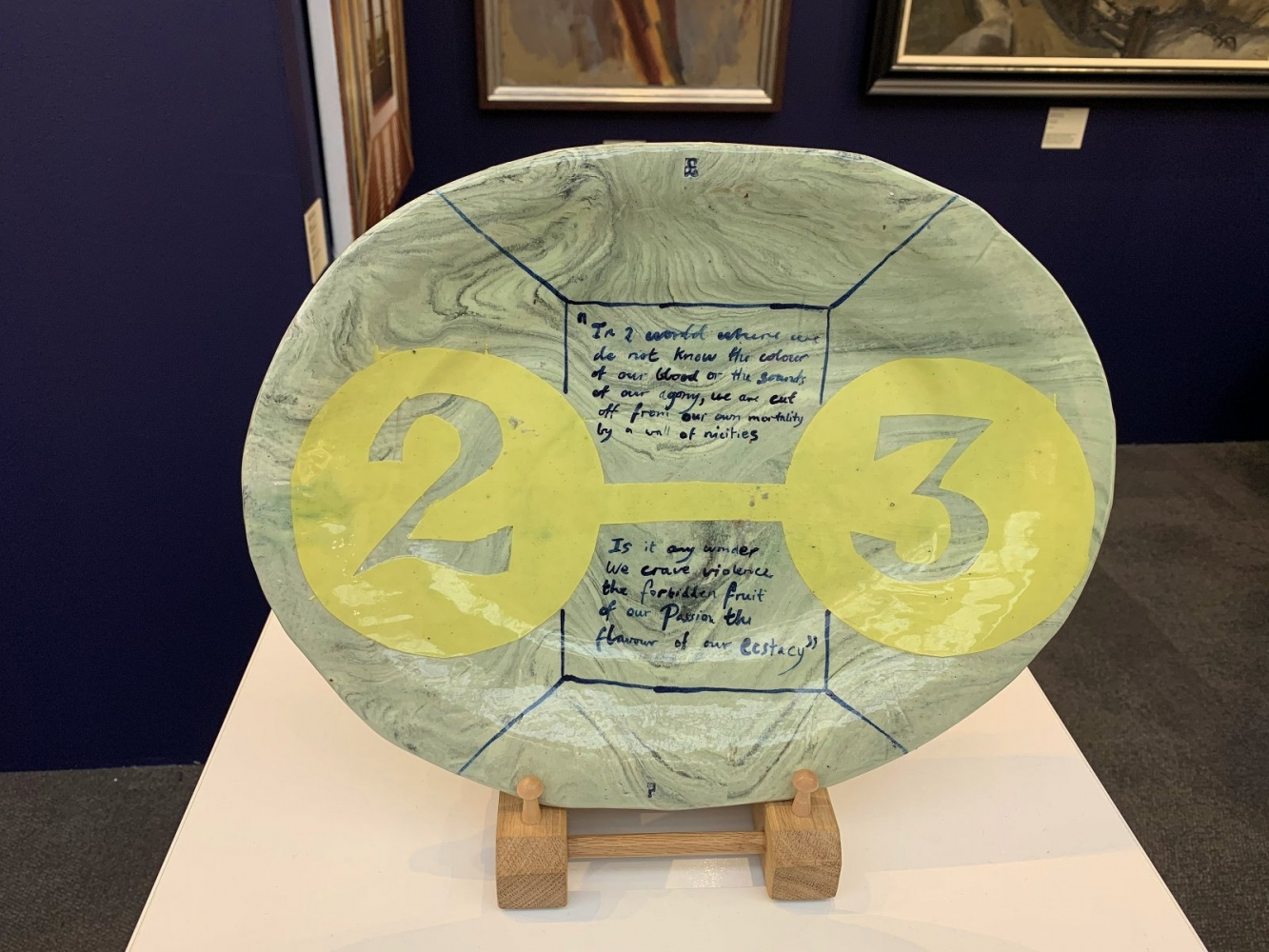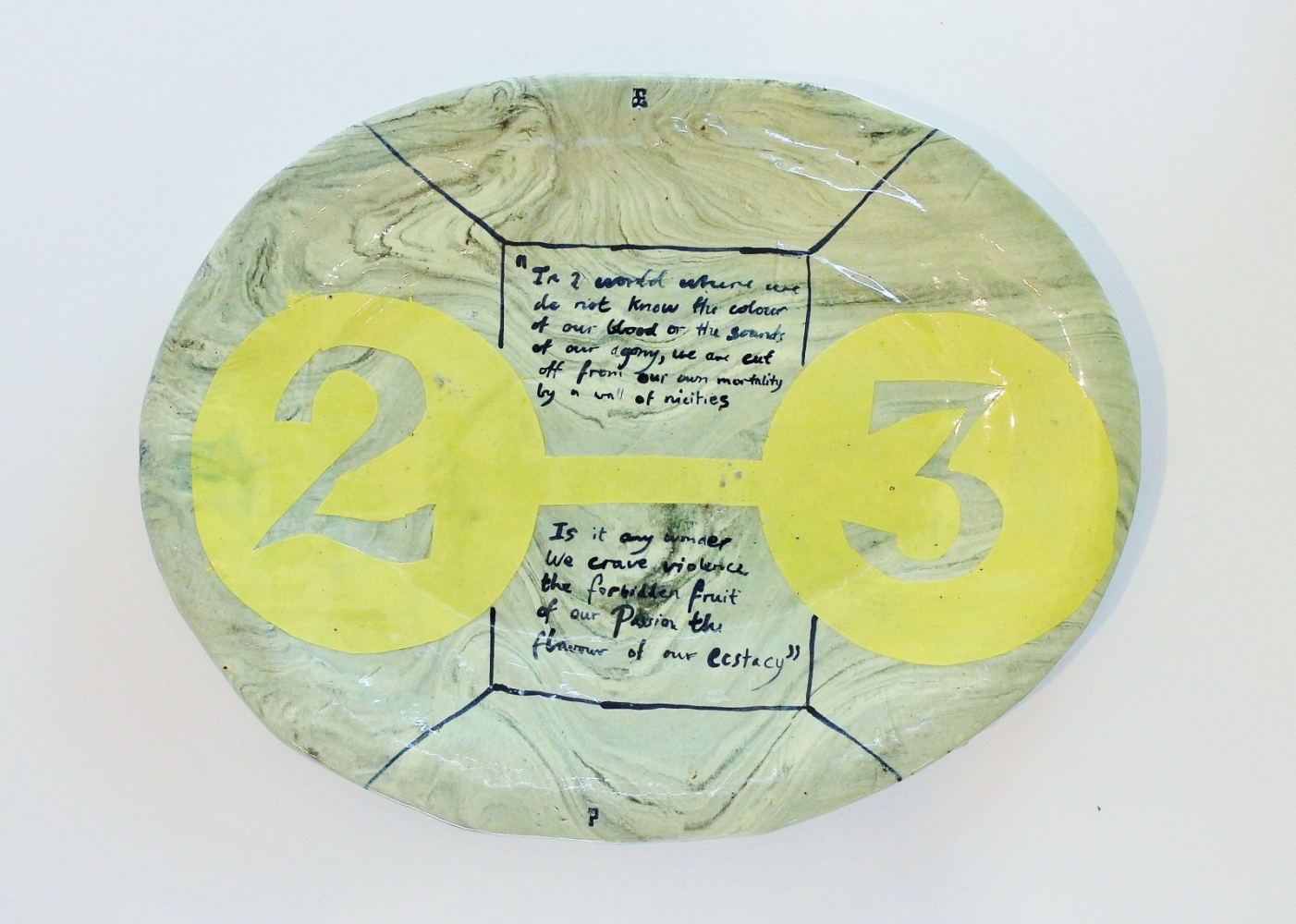 The prose to the front of the dish is likely a quotation from Aleister Crowley (under research), the famous English occultist, poet and oft magician; hence the reference to the number 23, a number of significance within such circles