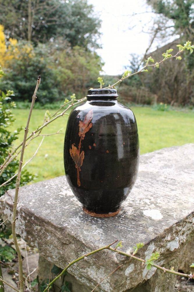 Footed bottle, tenmoku, iron motif by Jim Malone