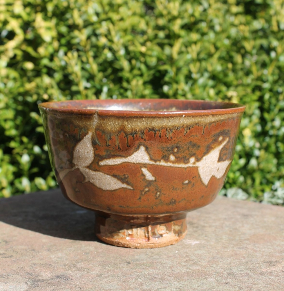 Teabowl, wax resist, kaki and ash glaze within by Jim Malone