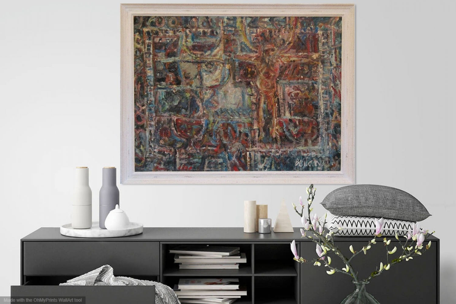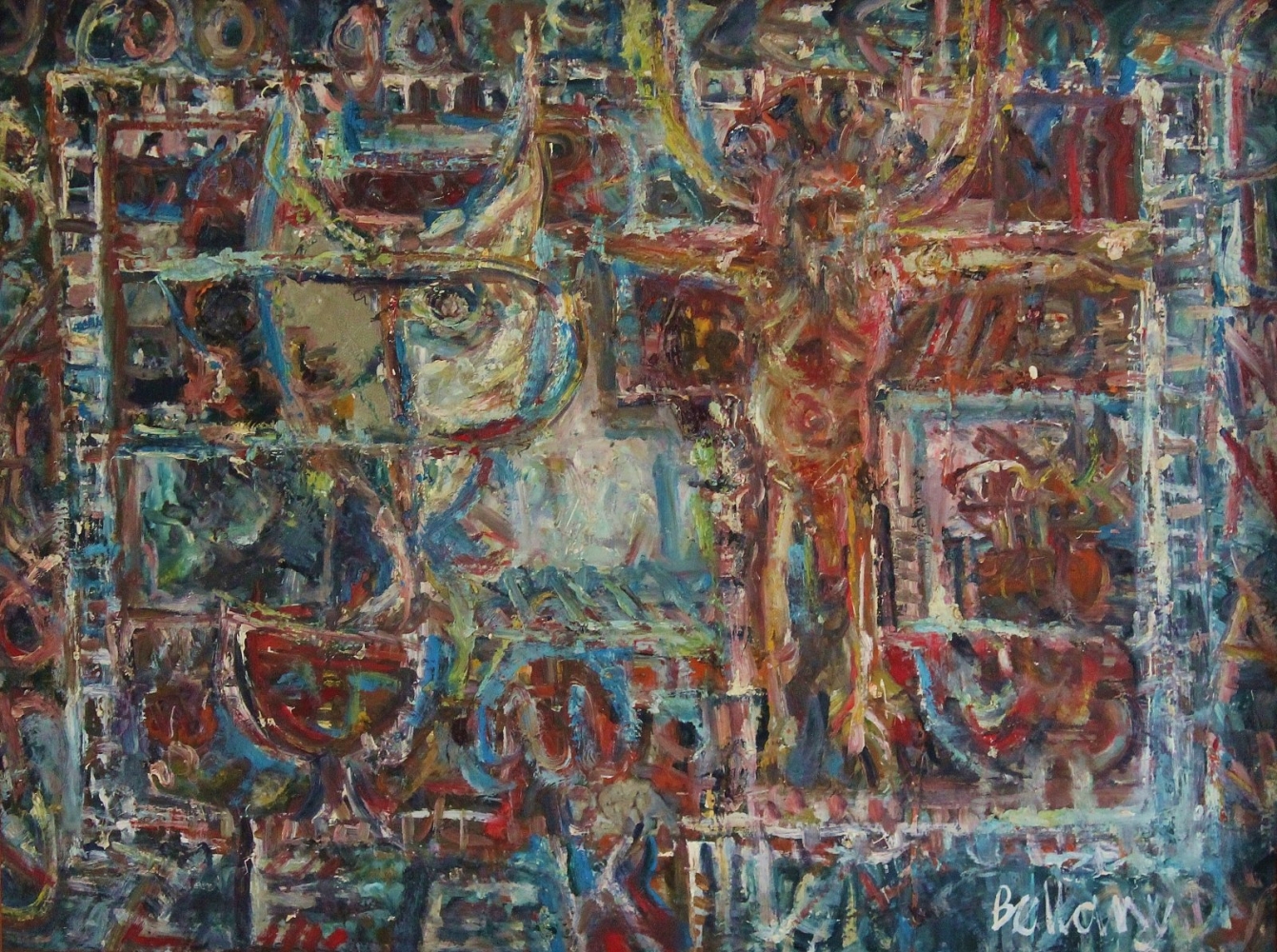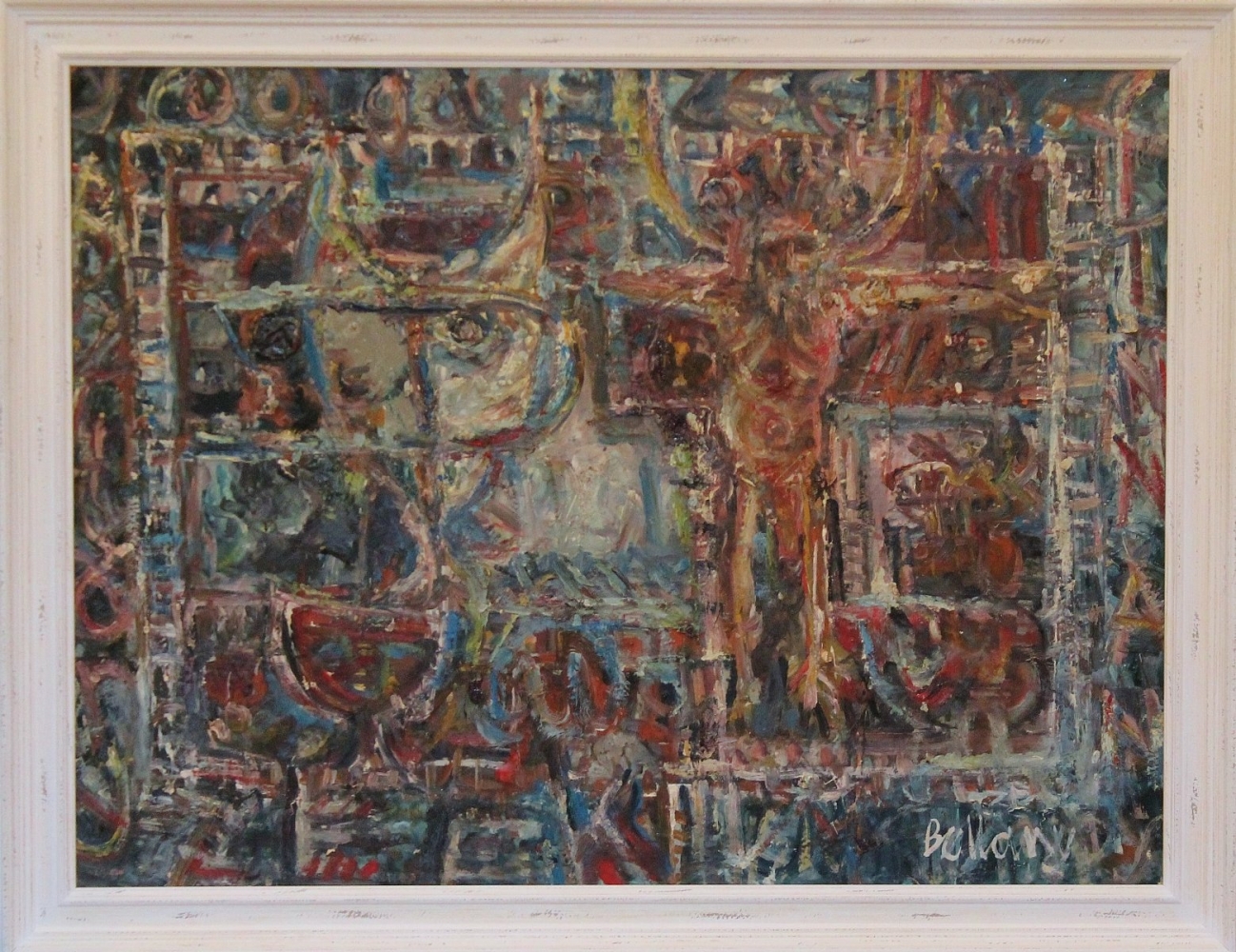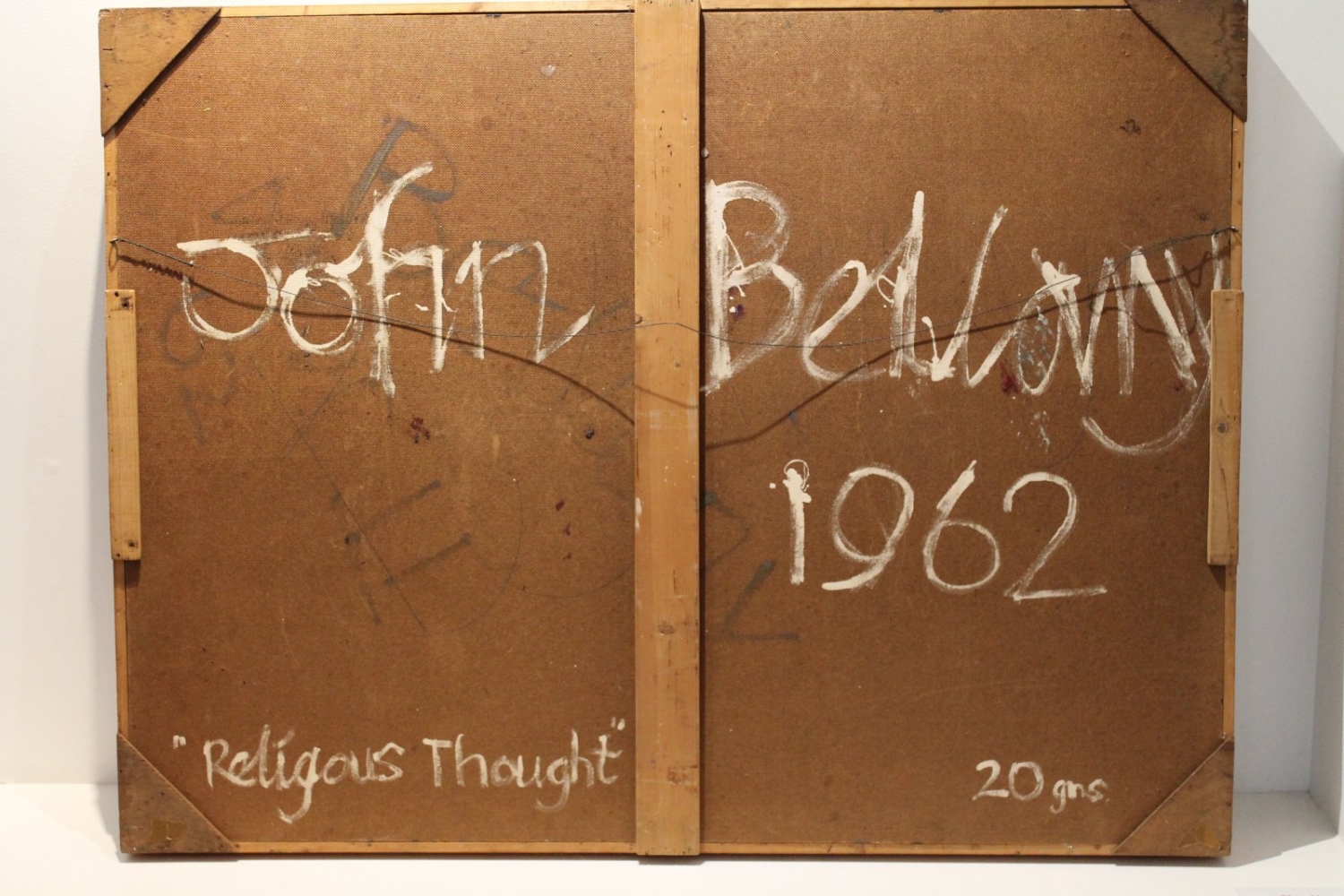In the context of his journey as a young artist, this is an important very early painting by John; embryonic with incredible complexity, showing a crucified Christ within an otherwise abstract motif, an early foretaste of religious symbolism. Religious Thought was produced when aged twenty, two years into his study at Edinburgh College of Art. Interestingly, there are elements reminiscent of the work of Alan Davie about the composition and motifs, an artist John admired greatly, especially in his early art-years