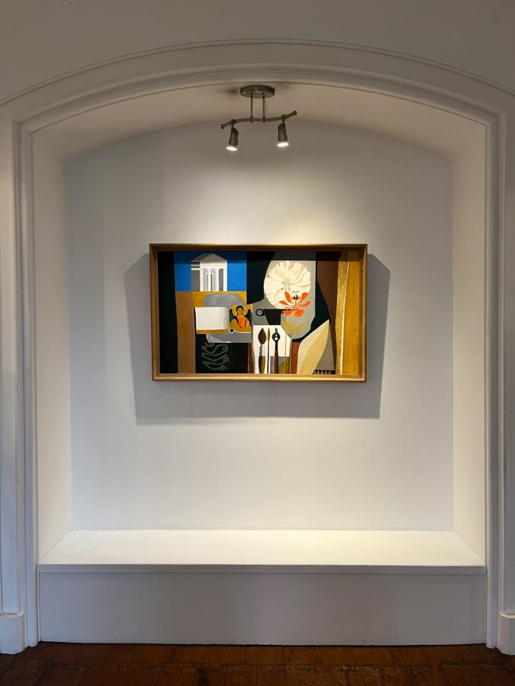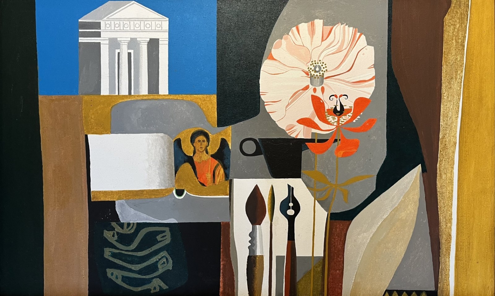 Treasury of Athens, Ikon and Paeonies is one of a series of ten paintings of the same size and media. All paintings in this series have Mediterranean themes, mainly of Greece and Delphi, those being visited locations during a trip in the summer of 1979. All works in the series were initially designed to be exhibited unframed, either as individual images, or hung edge to edge as a horizontal panorama and this painting was displayed in this way in the Peter Yates Retrospective ‘Cyclops Rock’ exhibition at the Hatton Gallery, Newcastle University, 1982, from which it was sold, and subsequently framed soon thereafter.