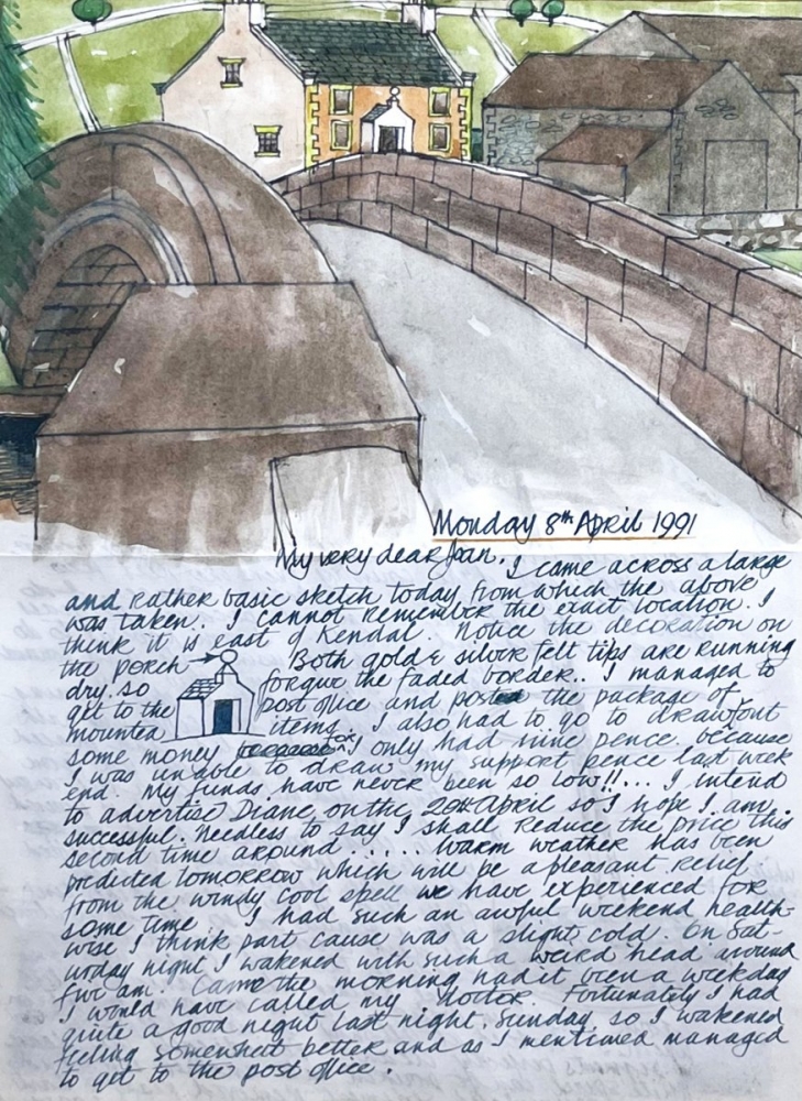 Painted letter, addressed to close friend, Joan David, dated 8th April 1991. Within the letter Percy discusses his dire finacial situation (nine pence to his name and the possible sale of his car) together with ongoing ill-health.