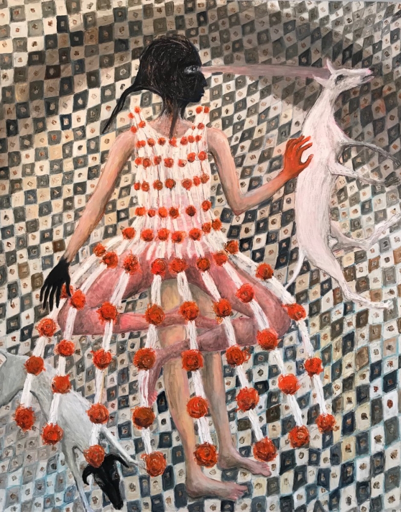 Woman in connecting dress of cells by Rebecca Swainston