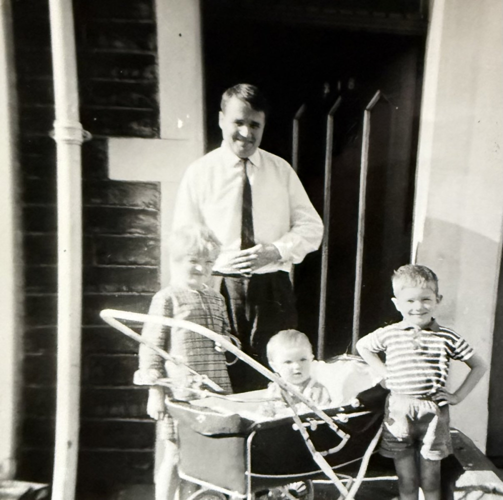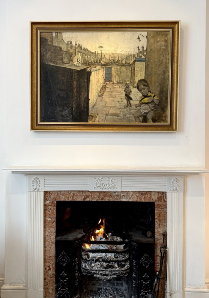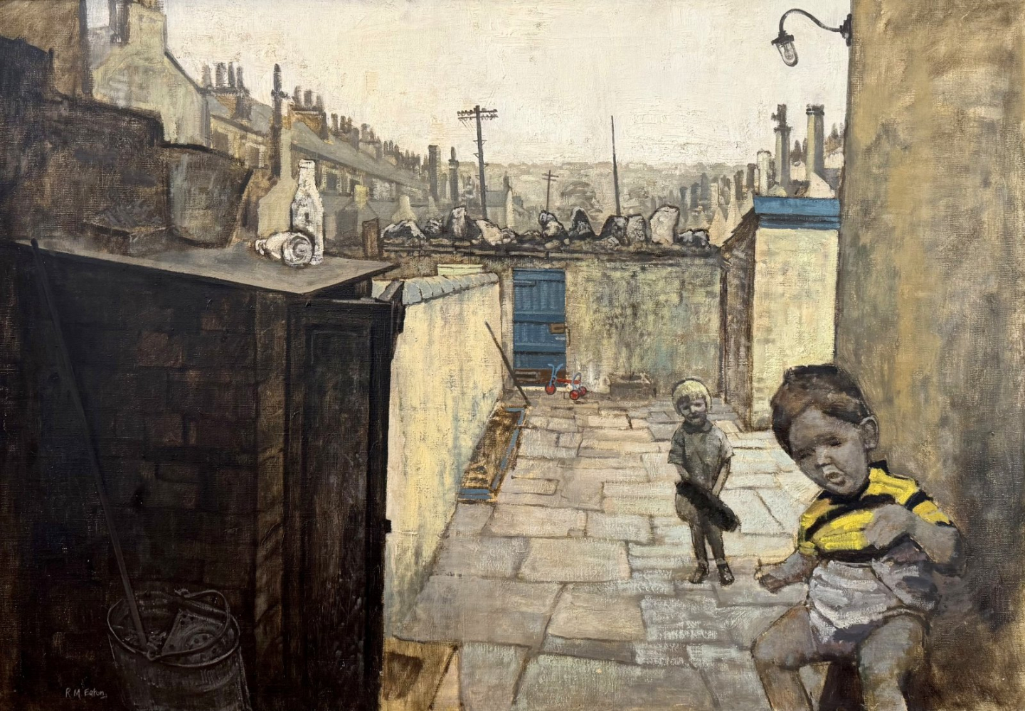 A wonderful northern gritty depiction of two of the artist's young children in 1963, playing in the back yard of their house in Blackburn Road, Accrington, Lancashire.