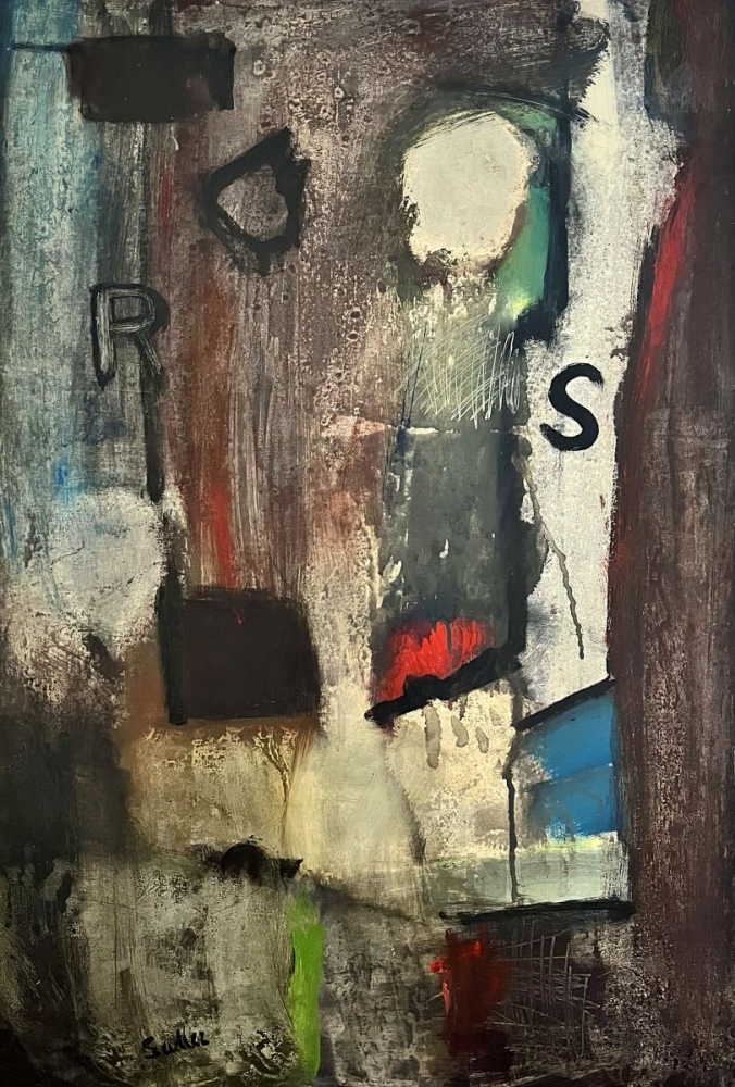 A wonderful and complet abstract painting on board by Robert Sadler. Signed lower left-facing and with initials R S incorporated as part of the composition.