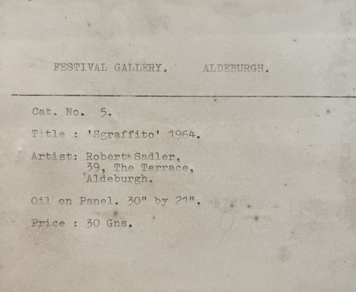 Exhibited at the Festival Gallery, Aldeburgh in 1964 priced at 30 Gns, label verso