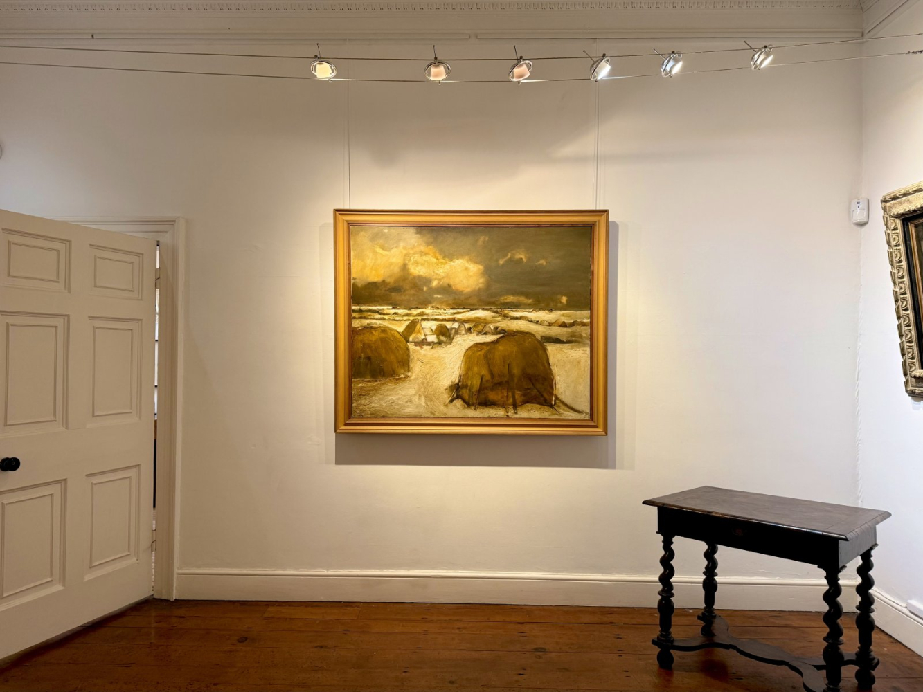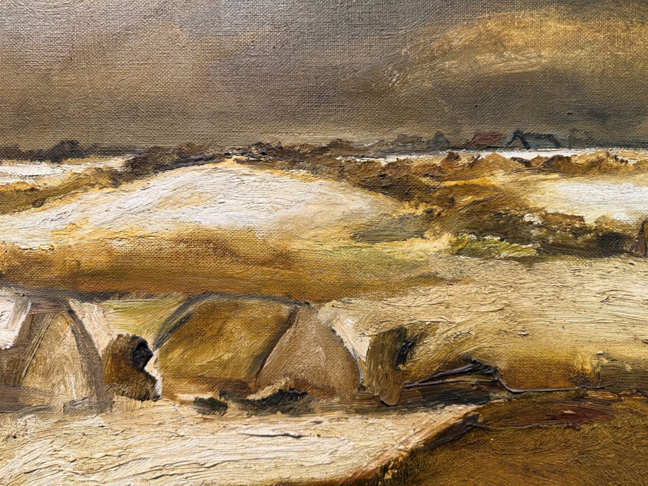 Signed 'FELL' (lower right); further signed and titled 'HAYSTACKS IN WINTER/Sheila Fell' (on a label attached to the stretcher)