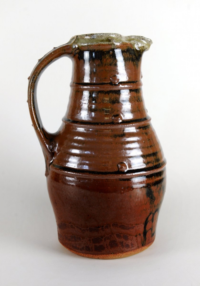 Baluster jug, bands and pellets, tenmoku and ash glazes by Jim Malone
