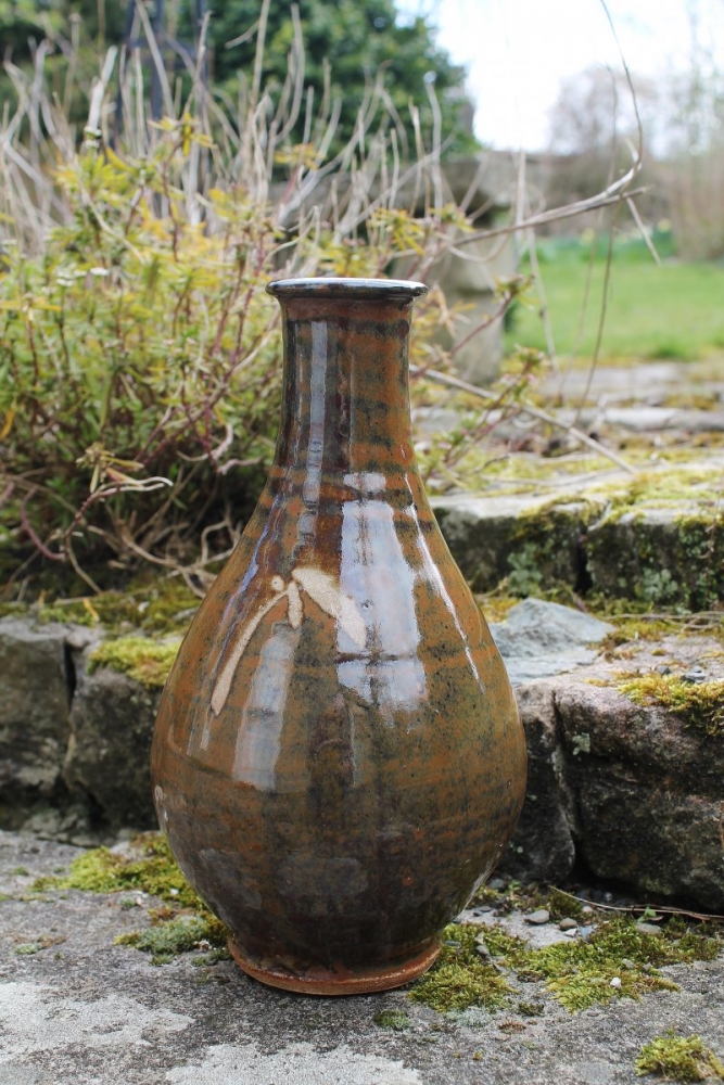 Korean type footed bottle, wax resist pattern, kaki glaze by Jim Malone