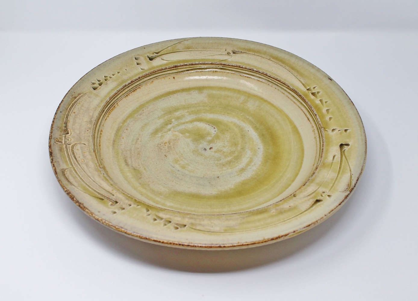 Large dish, engraved grasses, sycamore ash glaze by Jim Malone